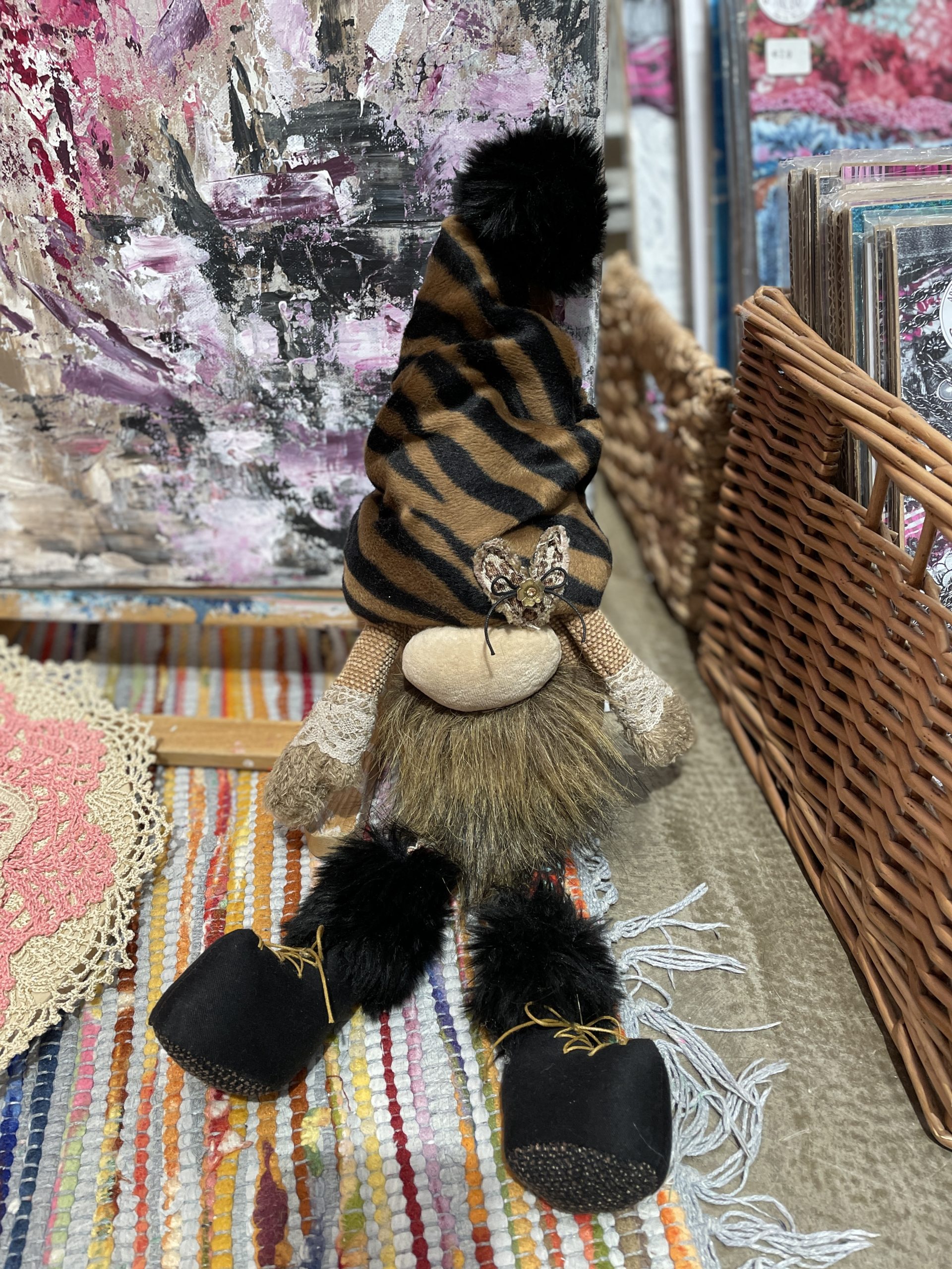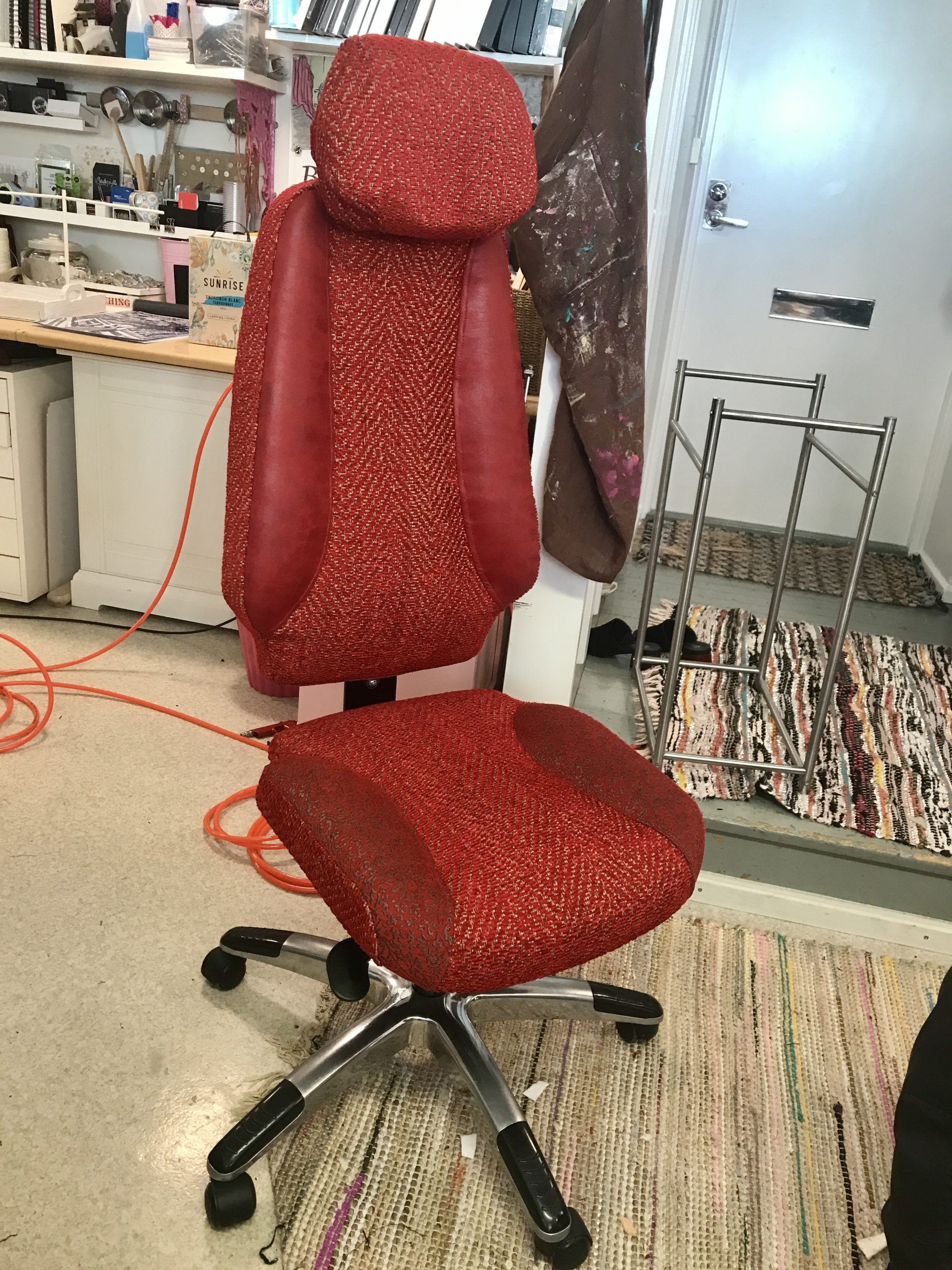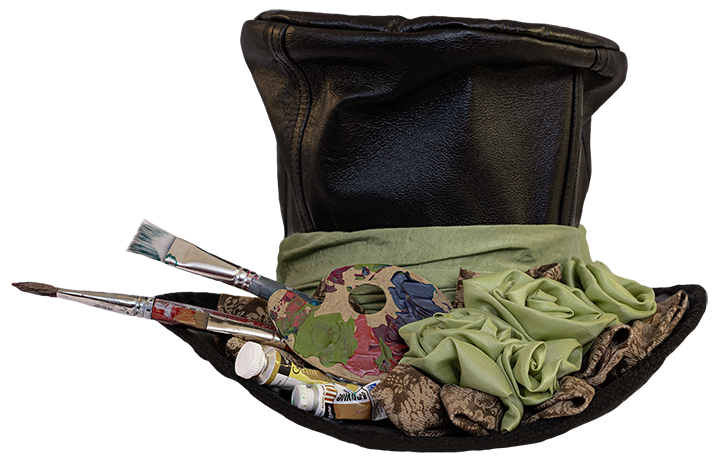 Tornion Kuvataideseuran käyttöön tapahtumissa. Aitoa nahkaa kirppistakista. Taitelijan tuhoamat, kuivumaan jätetyt pensselit somisteena. Käytössä kestävä ja hiilijalanjälki nolla.