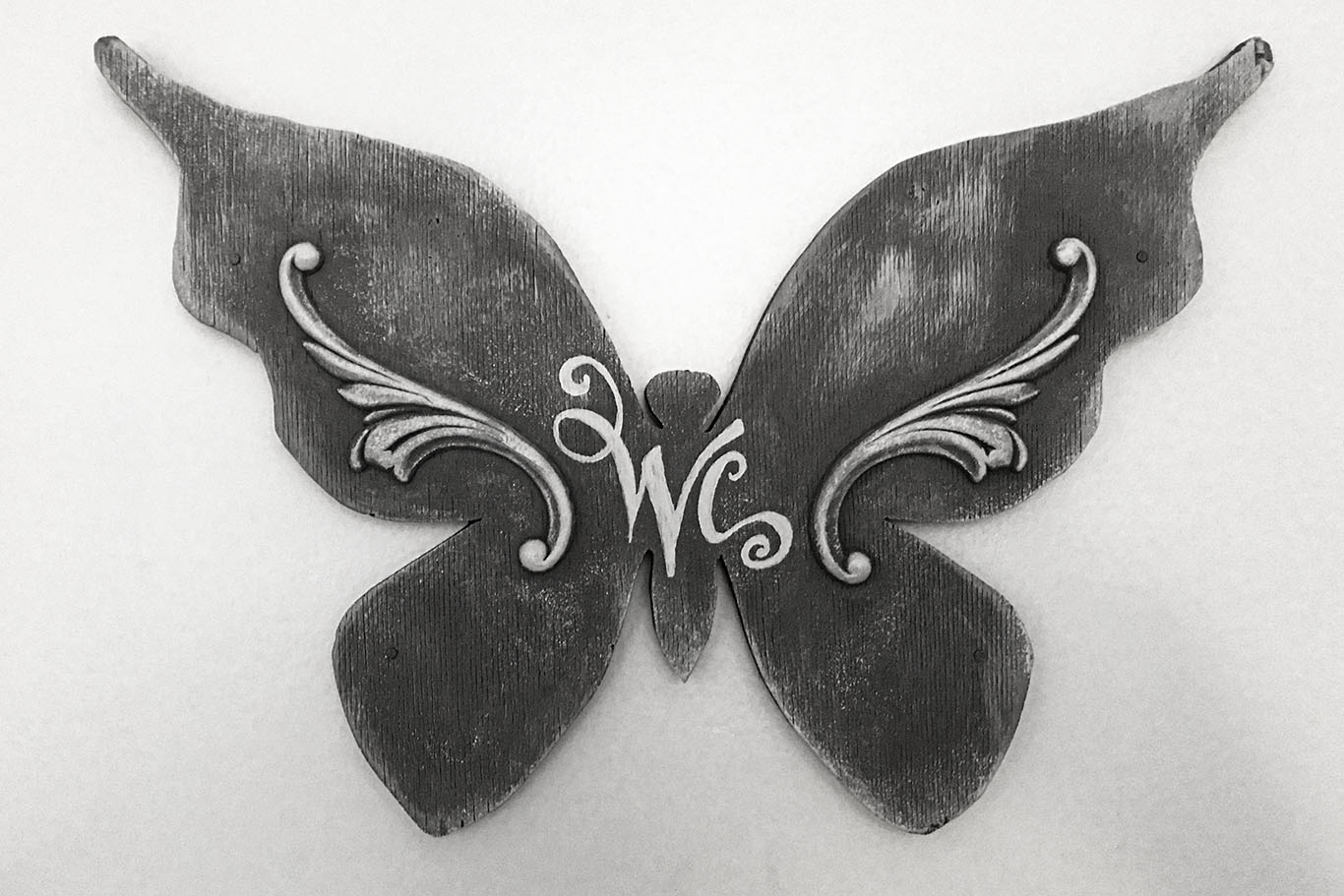 Kuviosahalla muotoonleikattu vaneriperhonen, puukoristein ja kalkkimaalein.