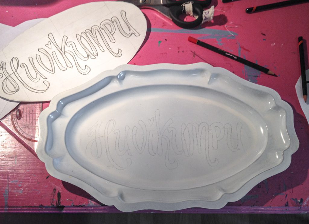 Aikoinaan tyttären The leikkimökkiin tehty. Talteen kerätty odottamaan ateljeeta. Metallinen kirppistarjotin metallimaalein.