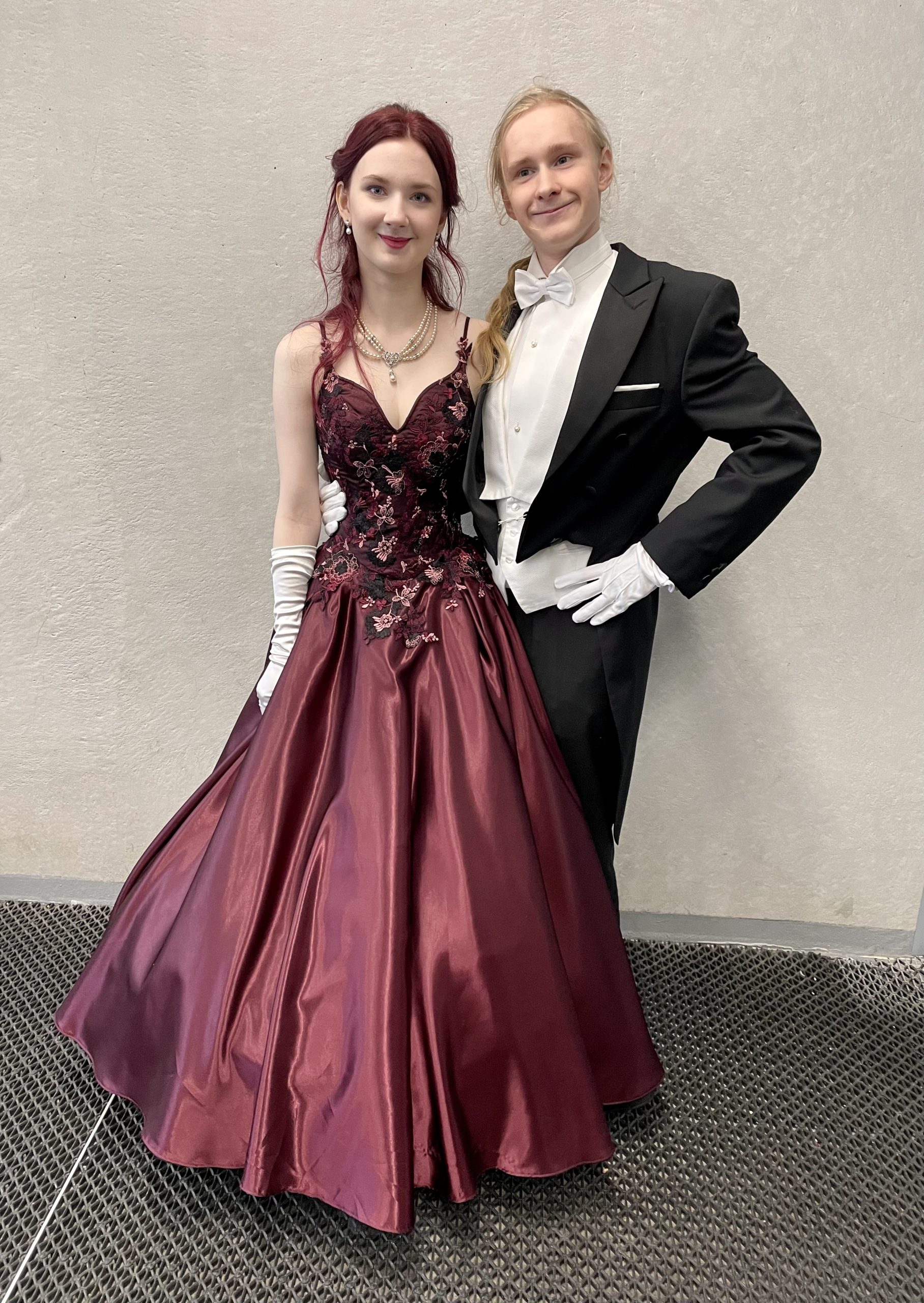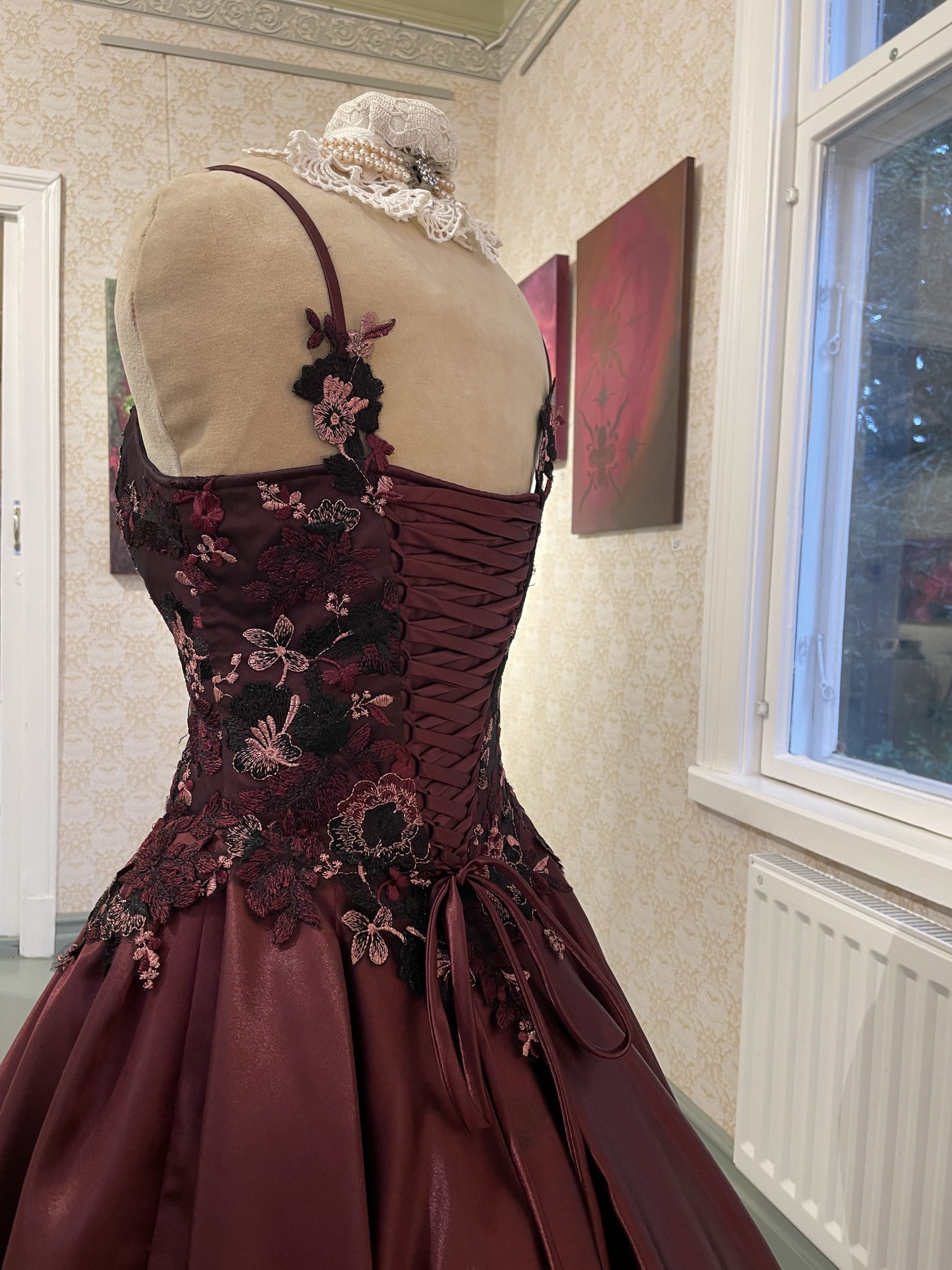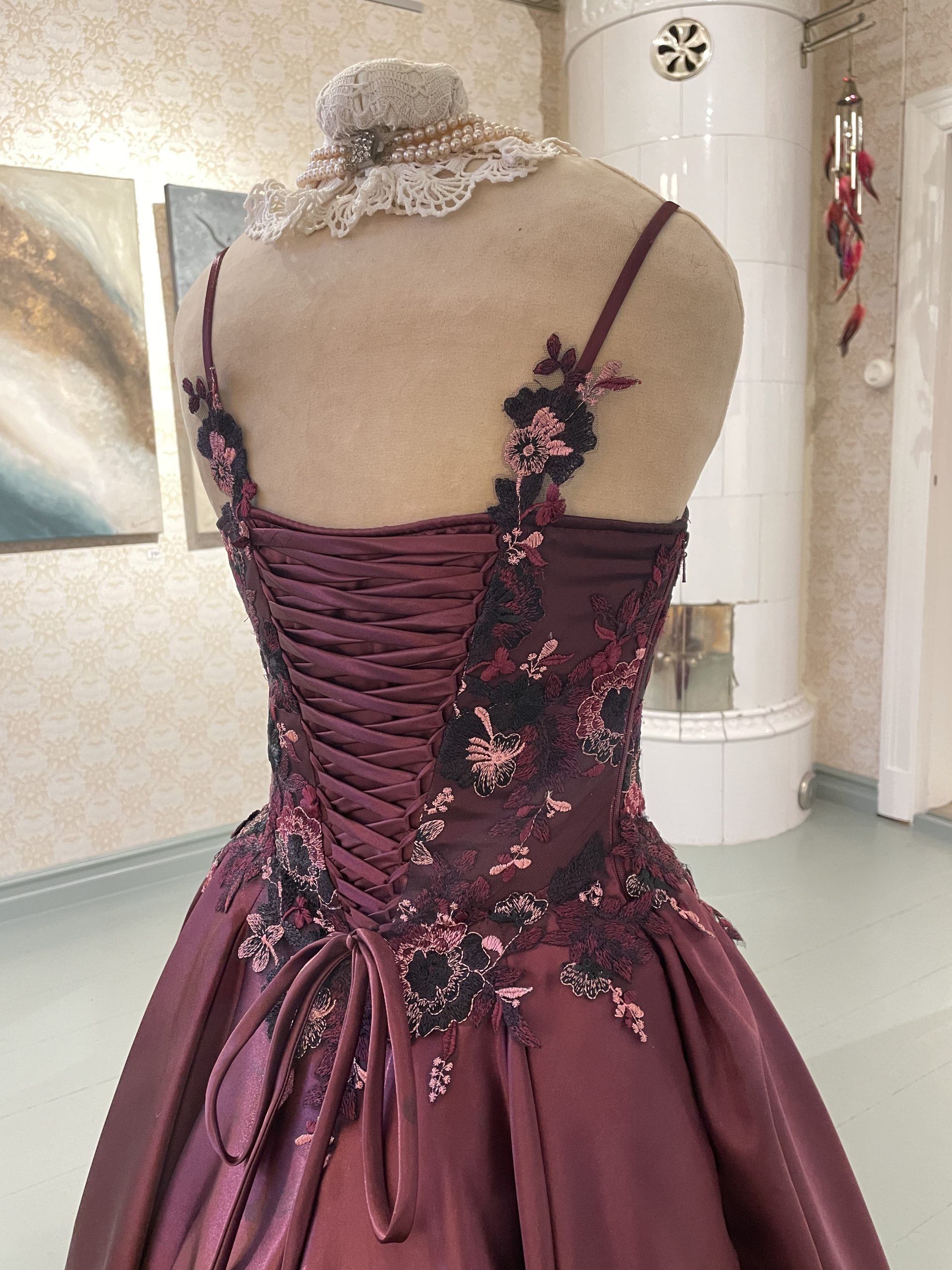 Vanhojen tansseihin tyyliin sopivat korkkarit. Pitsit paikoilleen käsinommellen.