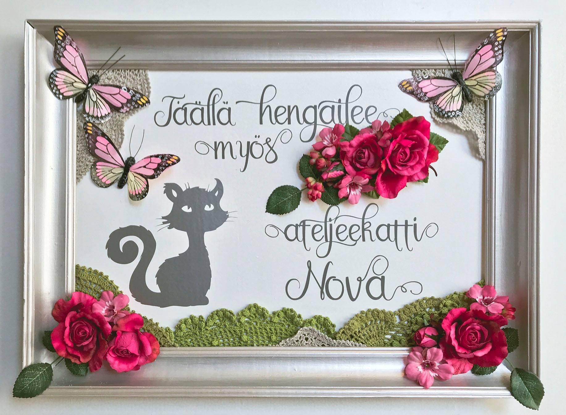 Kuviosahalla muotoonleikattu vaneriperhonen, puukoristein ja kalkkimaalein.