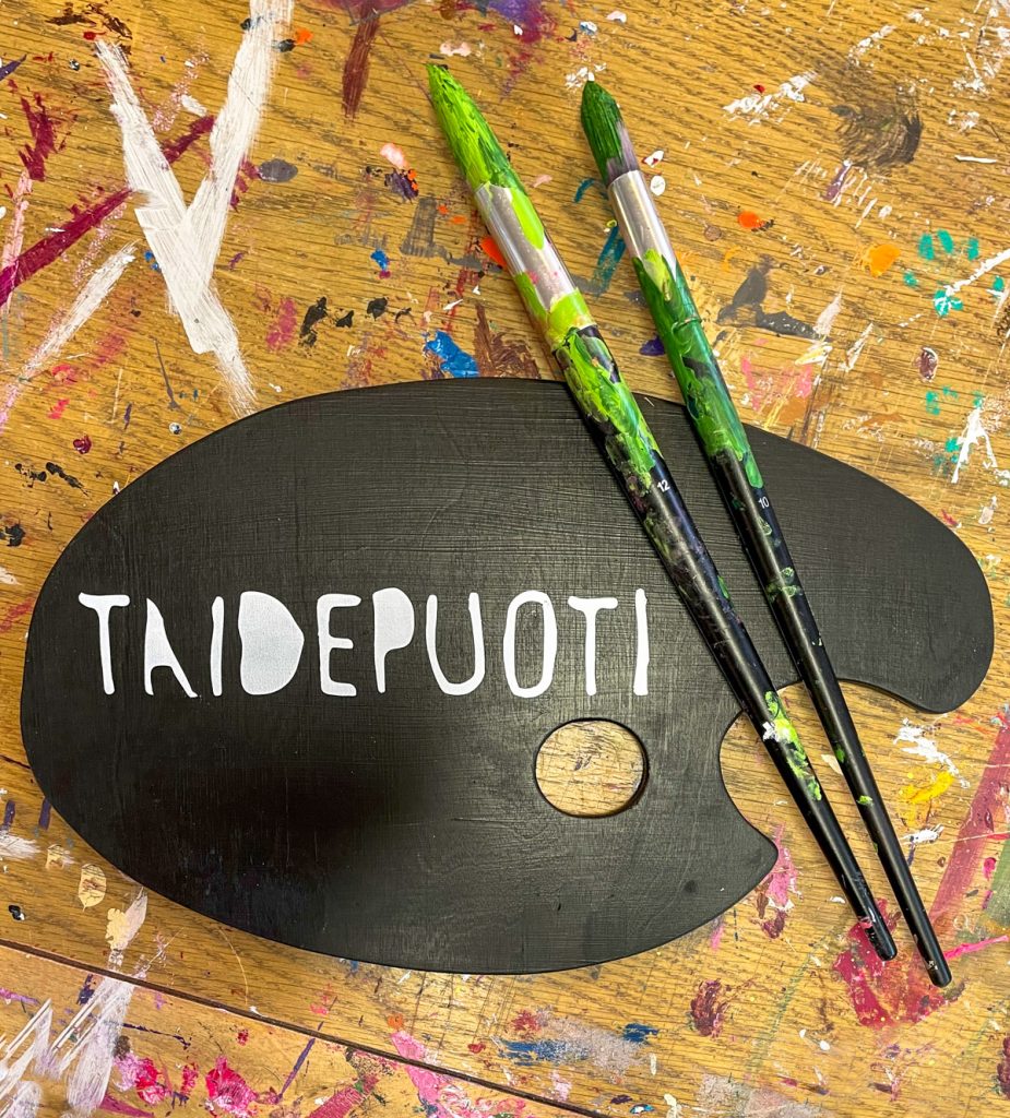 Tornion Kuvataideseuran Taidepuodille vanerikyltti. seuran logo suunnitelun pohjana, Toteutus vanerille. Syvättynä kuvana myös graafiseksi elementiksi. Brändin väerissä.
