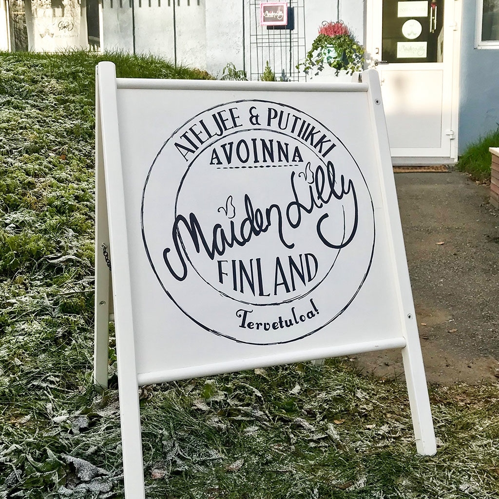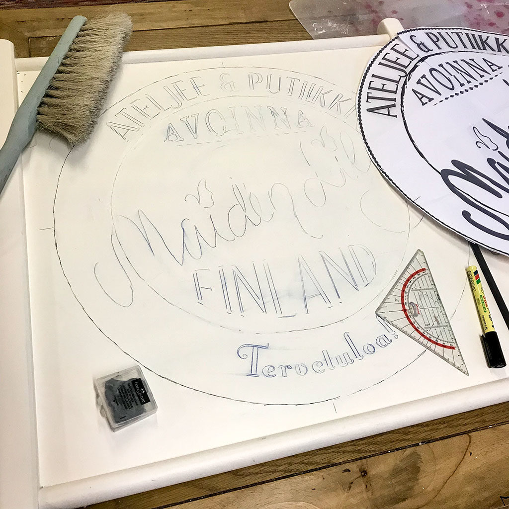Ateljeeputiikki Down Under sai perinteisen ulkoständin osiin puretusta, vanhasta puisesta pinnasängystä. Vanhanaikaisesti jäljennöspaperilla siirretyt ääriviivat. Viimeistely mustalla permanenttitussilla. Budjetti 0 €.